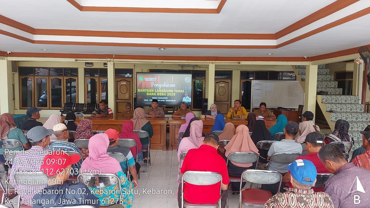 Sidoarjo || Breakingnewsnusantara.com – Pemerintah Desa Kebaron, Kecamatan Tulangan, Kabupaten Sidoarjo bersama Badan Permusyawaratan Desa (BPD) Desa Kebaron kembali melaksanakan menyaluran Bantuan Langsung Tunai Dana Desa (BLT-DD) tahap I periode bulan Januari, Pebruari, Maret, di Pendopo Desa Kebaron, Kecamatan Tulangan, Kabupaten Sidoarjo, pukul 08.00 wib – selesai, Senin (24/03/2025).