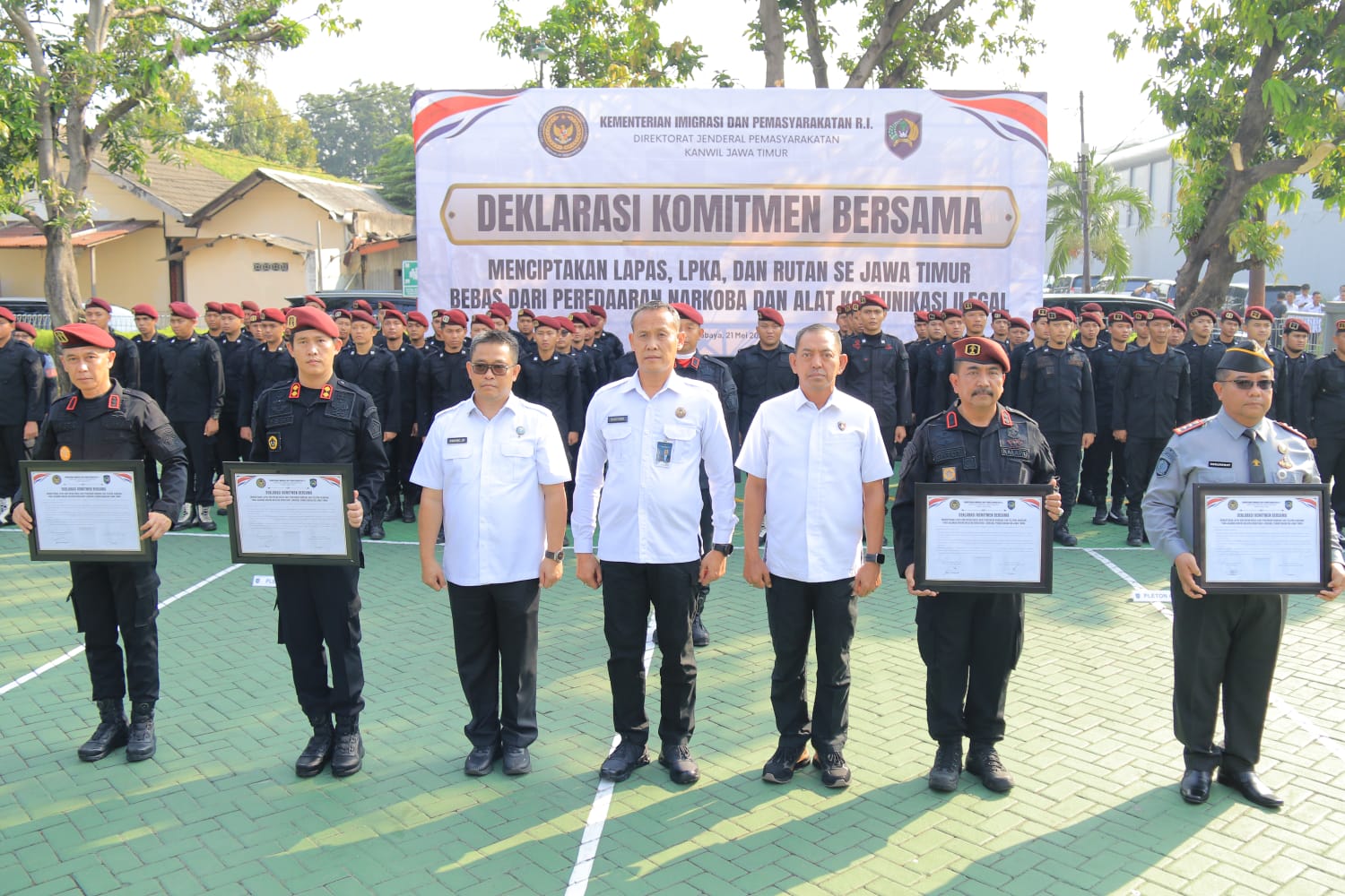SIDOARJO — Kantor Wilayah Direktorat Jenderal Pemasyarakatan (Ditjen PAS) Jawa Timur menyatakan komitmen penuh untuk menciptakan Lapas dan Rutan yang bersih dari peredaran narkoba dan penggunaan telepon genggam ilegal. Komitmen tersebut dituangkan dalam kegiatan Deklarasi Komitmen Bersama, yang digelar Rabu (21/5) di Markas Kanwil Ditjenpas Jawa Timur.