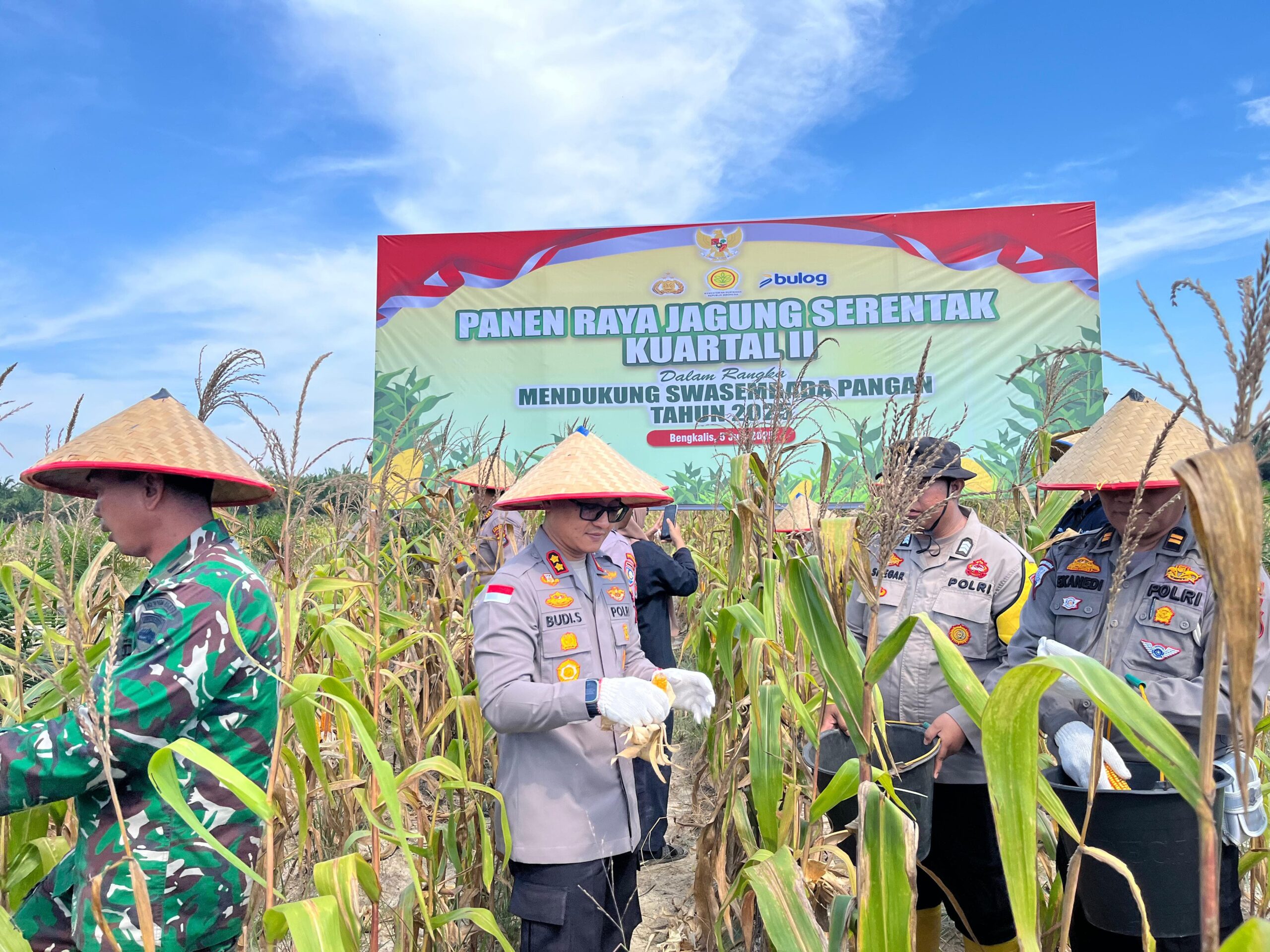 Sidoarjo – Komitmen mendukung swasembada pangan nasional ditunjukkan Pemerintah Kabupaten Sidoarjo. Sinergi Forkopimda Sidoarjo untuk mewujudkan program Presiden Prabowo tersebut diperlihatkan siang tadi, Kamis, (5/6). Bupati Sidoarjo H. Subandi, Kapolresta Sidoarjo Kombes Christian Tobing, Dandim 0816 Sidoarjo Letkol Inf Dedyk Wahyu Widodo, Kepala Kejaksaan Negeri Sidoarjo Roy Rovalino Herudiansyah serta Wakil Ketua DPRD Sidoarjo H. Kayan melakukan kegiatan panen raya jagung serentak di Desa Pangkemiri, Kecamatan Tulangan. Panen raya jagung dilahan seluas setengah hektar tersebut adalah kali kedua dilakukan Polresta Sidoarjo.