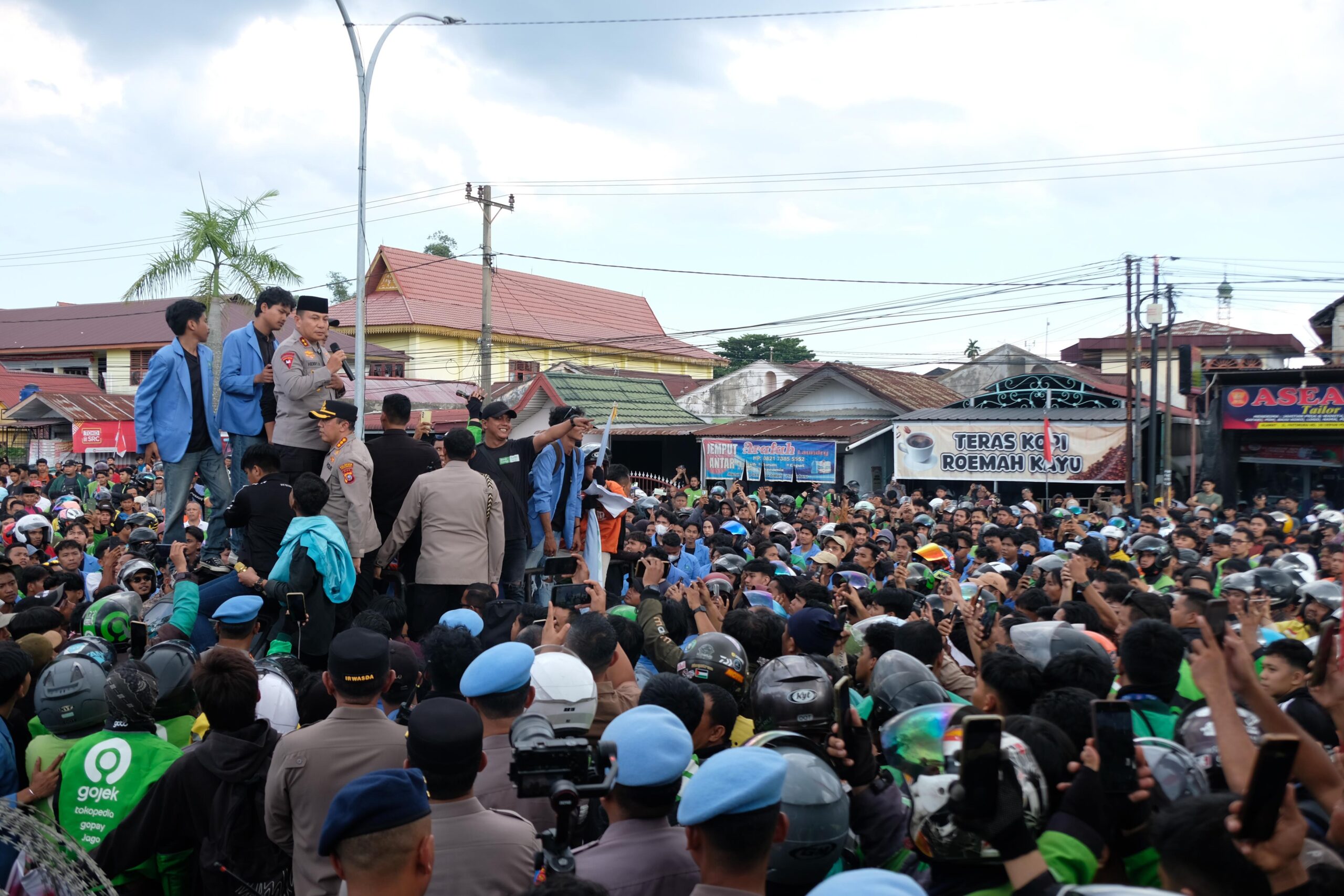 Massa ojol dan mahasiswa berorasi di depan Polda Riau. Ada sejumlah tuntutan yang disampaikan oleh massa, salah satunya menuntut pengusutan tuntas kasus Affan yang dilindas rantis Brimob di Jakarta hingga tewas.