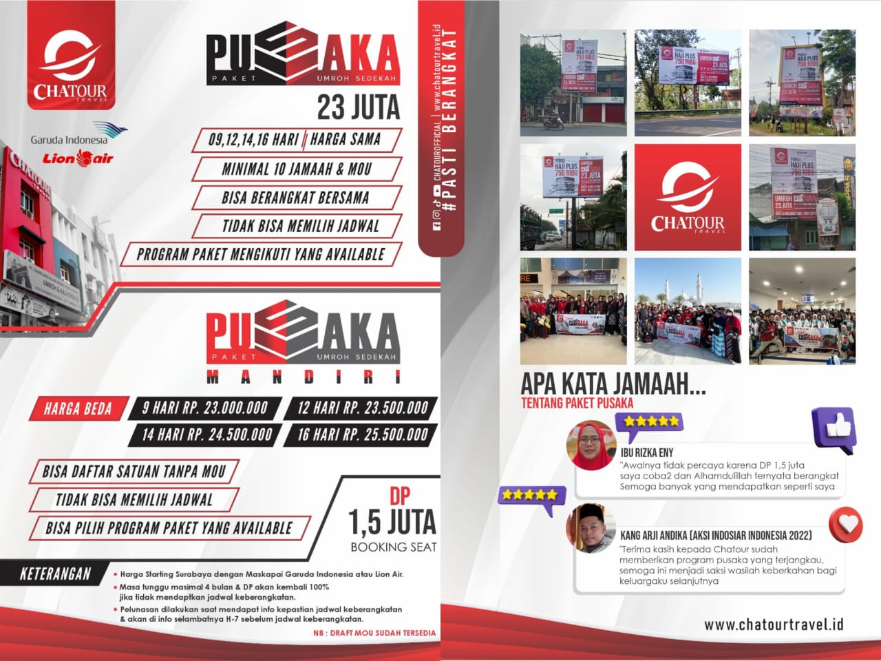 Chatour PUSAKA menawarkan harga bersubsidi, pilihan durasi 9–16 hari dengan harga sama Rp23 juta, serta fasilitas pesawat tanpa transit dan hotel tanpa shuttle bus. Jamaah cukup membayar deposit Rp1,5 juta per orang yang akan dikembalikan 100 persen jika dalam 4 bulan belum berangkat.