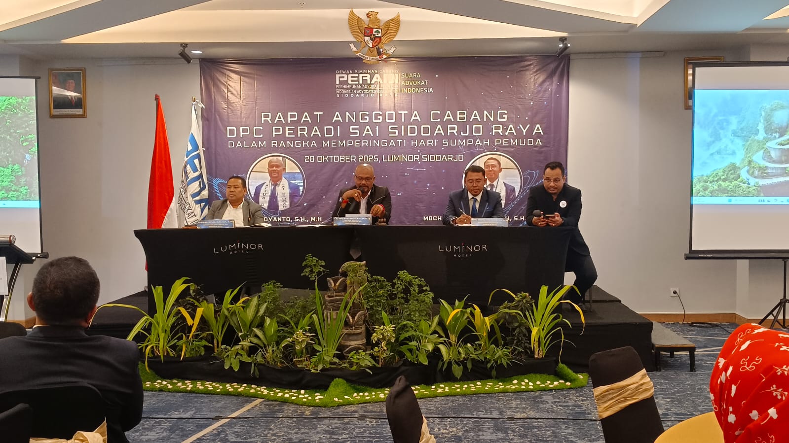 SIDOARJO – Bertepatan dengan peringatan Hari Sumpah Pemuda, Dewan Pimpinan Cabang (DPC) Perhimpunan Advokat Indonesia Suara Advokat Indonesia (PERADI SAI) Sidoarjo Raya menggelar Rapat Kerja (Raker) ke-2 yang dirangkai dengan perayaan HUT ke-2 organisasi di Hotel Luminor Sidoarjo Selasa (28/10/2025). Kegiatan tersebut dihadiri pengurus dan puluhan anggota untuk memperkuat komitmen serta sinergi antaradvokat.