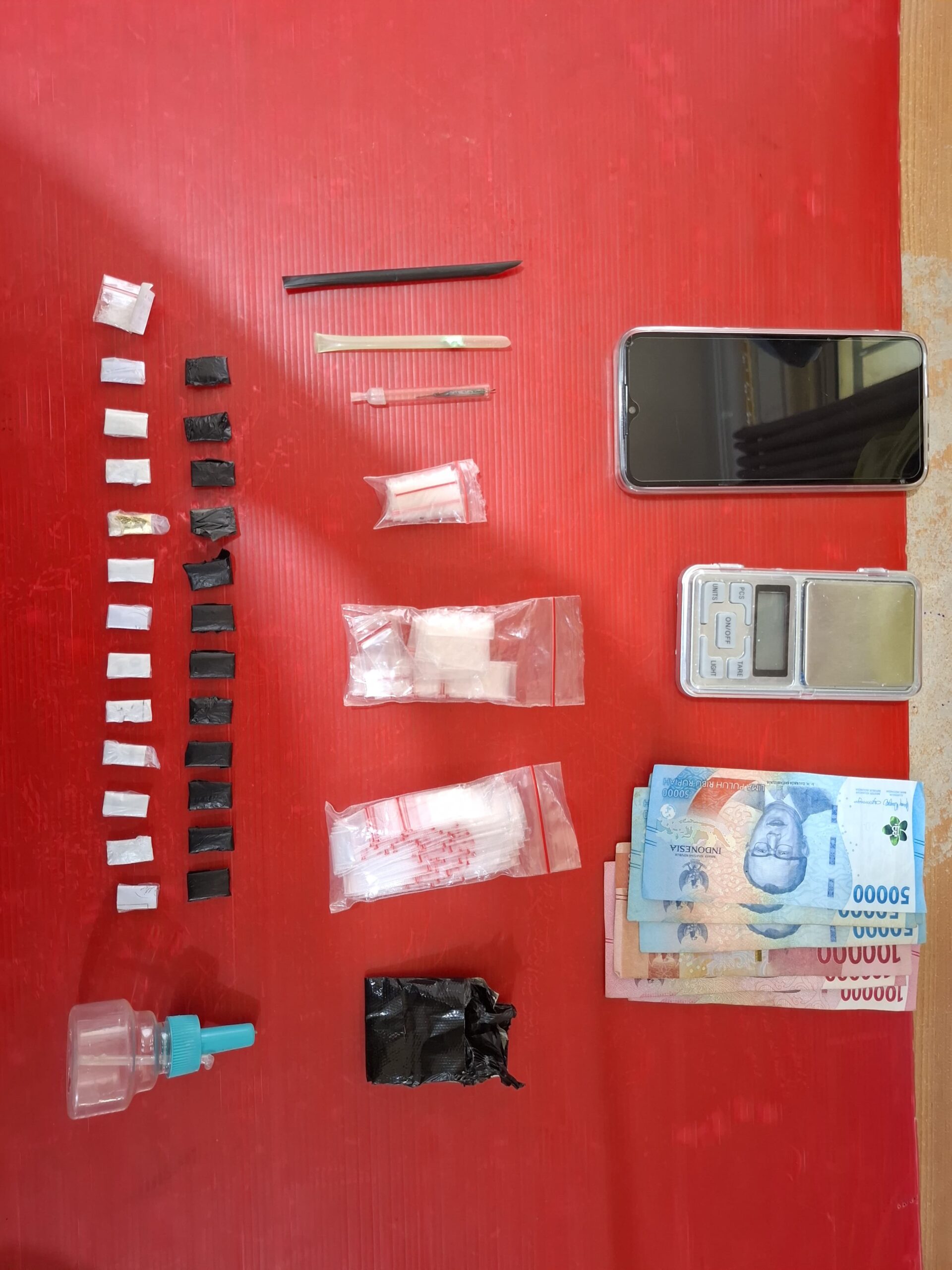 Dari hasil penggeledahan, polisi menemukan 25 paket plastik klip kecil berisi diduga narkotika jenis sabu. Selain itu, turut diamankan barang bukti lainnya berupa satu buah bong, dua sendok pipet, satu kaca pirex, tiga bal plastik klip kosong, satu lembar lakban hitam, satu unit timbangan digital, satu unit handphone merk Vivo warna biru dongker, serta uang tunai sebesar Rp500.000 yang diduga hasil transaksi.